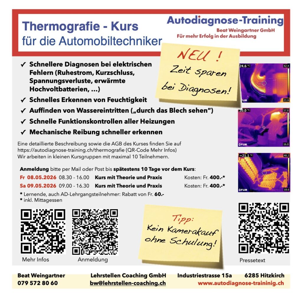 Der Kauf einer Kamera ist nur sinnvoll, wenn der Anwender die wichtigsten Grundlagen der Thermografie und der Kamerabedienung kennt. Im Kurs werden die Einsatzmöglichkeiten und die Grenzen der Thermografie aufgezeigt. Ebenso wird erfahren, welcher Kameratyp für die Anwendung in der Garage am besten geeignet ist. Wir empfehlen Kameras in einem Preissegment von 450.- … 1500.-, verkaufen aber ganz bewusst keine Kameras.